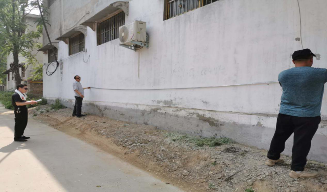 5月2日,县职业中专教师志愿者实地测量文化墙尺寸