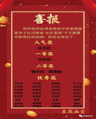 在庆祝建党100周年,河南省在线举办的“出彩家庭”才艺展赛公益活动中,威尼斯官网高二年级美术专业的学生们积极参与,线上报送绘画作品,取得了骄人的成绩。36名同学获奖,其中徐世航同学包揽了人气奖和一等奖,杨子欣、陈雨佳两位同学获二等奖,申家薇等32名同学获优秀奖。