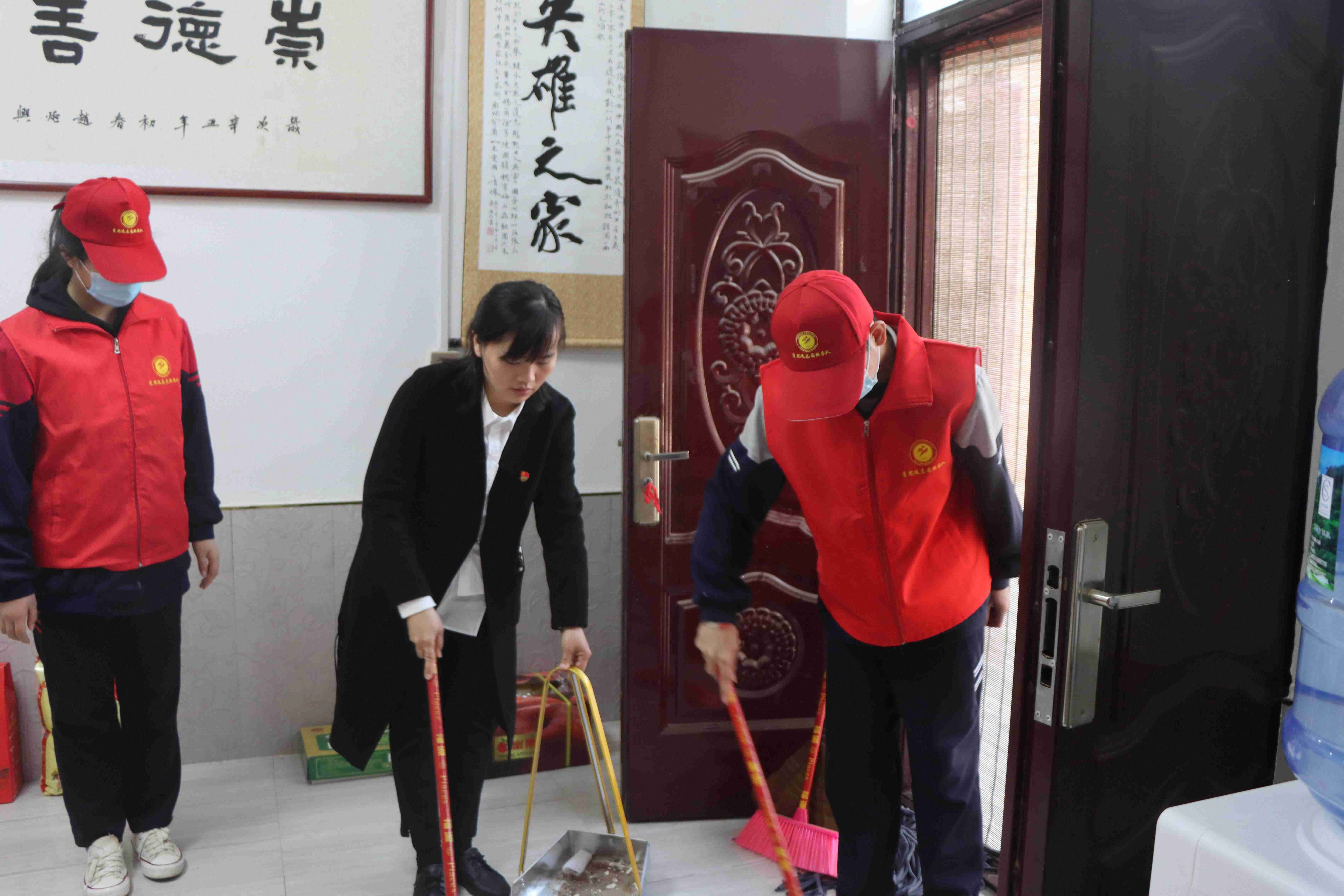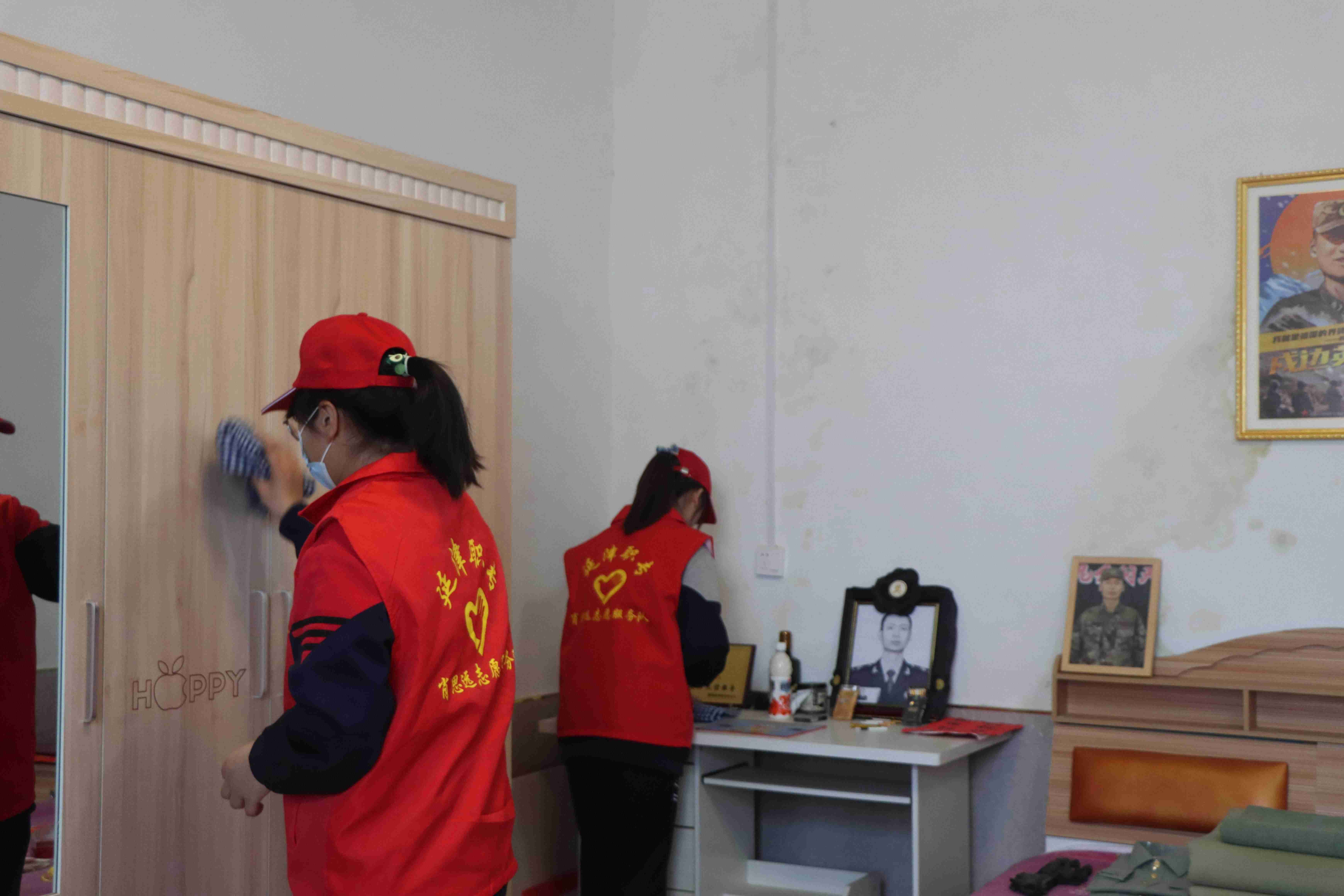师生们对烈士遗相鞠躬致敬之后,全体人员瞻仰烈士生前的用品与军功章等纪念品,共同追忆肖思远烈士那段悲壮的历史,深刻体会英烈不畏艰难、舍身营救自己的战友、甘于奉献的爱国主义精神。随后,志愿队员们便开始轻手轻脚地收拾房间,擦桌、扫地、擦拭门窗、打扫院落……志愿队员们的每一个动作都格外地轻柔和认真,生怕声响太大,打扰到英雄休息。