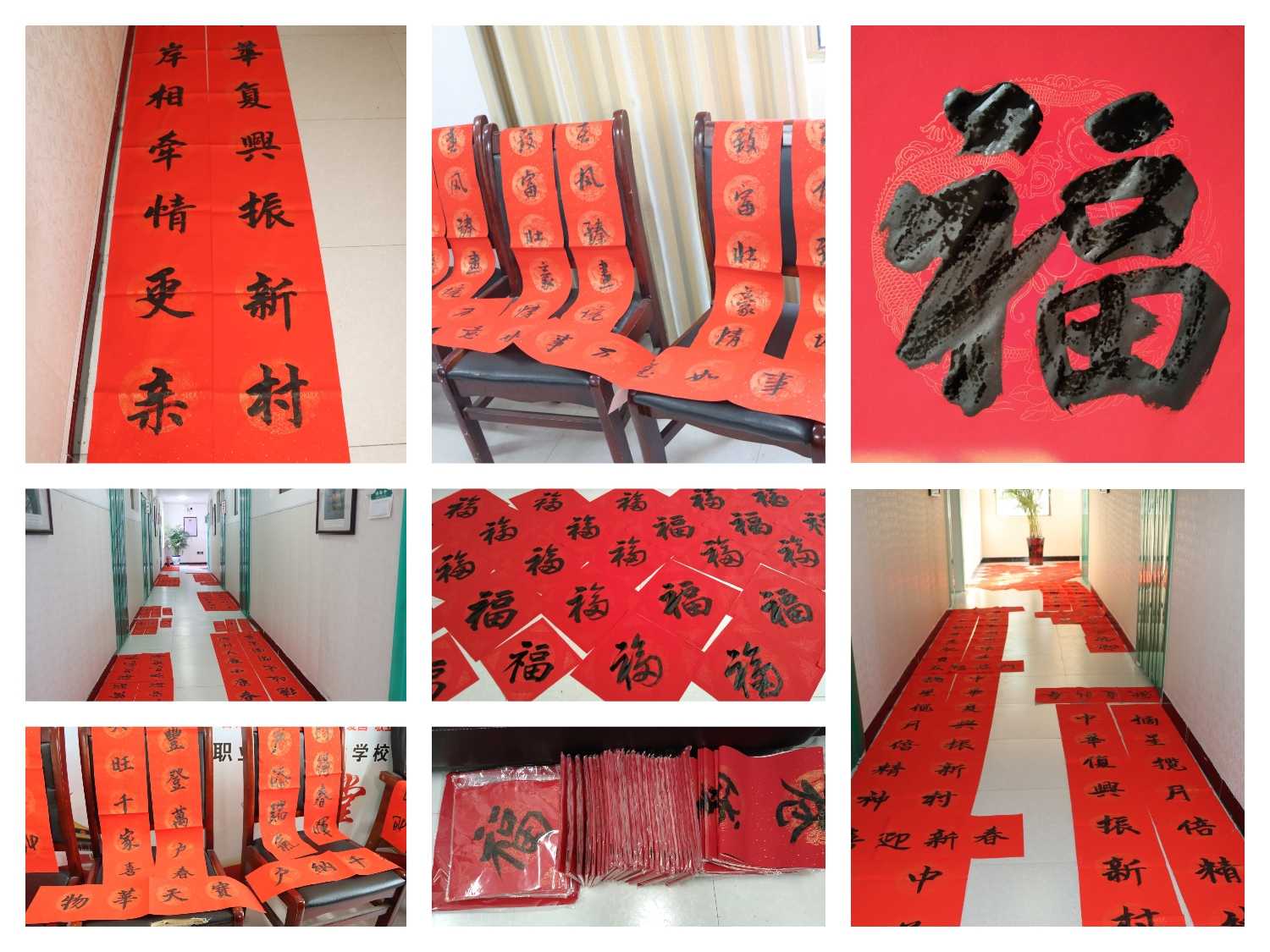 2023年元月8日上午,延津职专行政楼二楼会议室里以及走廊里,摆放着一幅幅刚刚写好,还未晾干的春联,这些春联都出自于我们学校的四位书法老师之手。临近春节,为进一步弘扬中华民族优秀传统文化,营造喜庆祥和的节日氛围,学校组织有书法爱好的教师“为贫困户义写春联,助力乡村振兴”志愿服务活动,为贫困群众家中增添节日的喜气,用文艺力量助力脱贫攻坚。