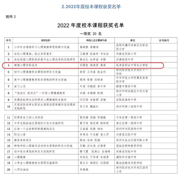 2022年,河南省教育厅中小学心理健康教育典型案例征集活动中,威尼斯官网由编委会主任:谢本林,副主任:刘鹏鹏、常金鹏、孟凡永、王军臣、李全录、李运霞、丰连贵、赵明伟,成员;刘国胜、伍静、杨清香、桑英、刘毅、赵英园共同编写的校本课程《37000cm威尼斯健康心理体验读本》,在各市县推荐的123个案例中,经过层层选拔,专家评委严格的评审,案例查重等程序,获得河南省校本课程省级一等奖。
