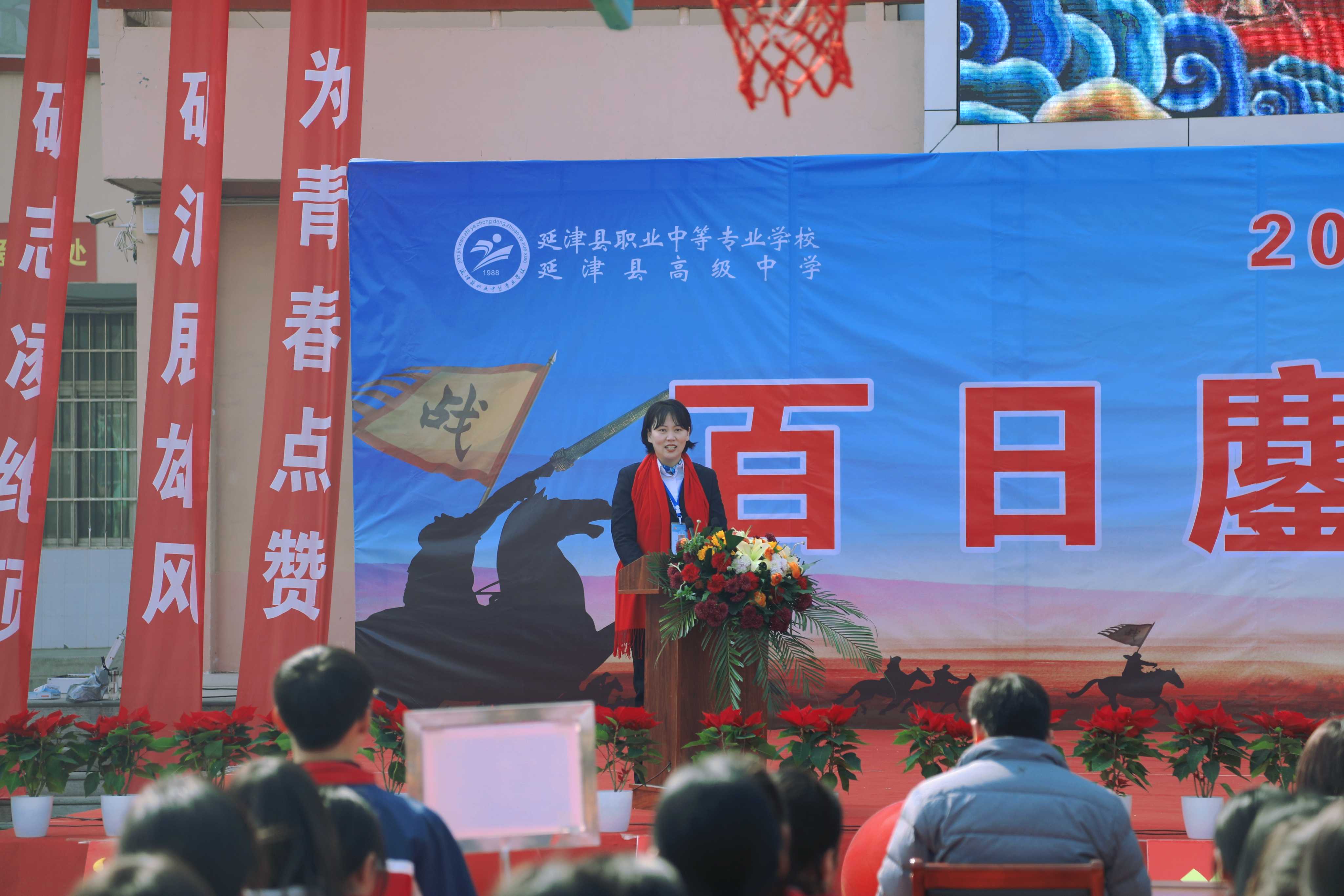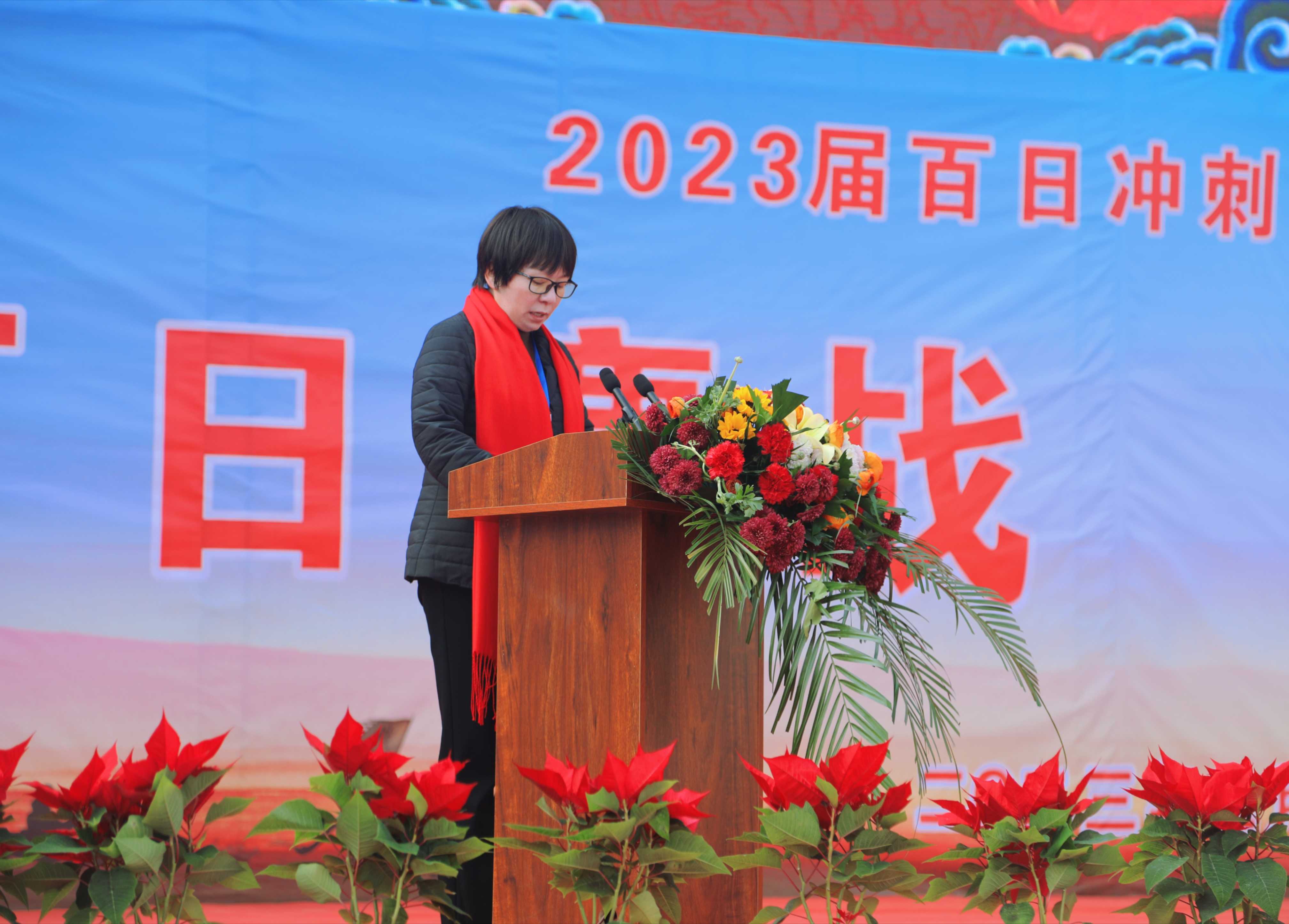 高三教师代表赵娜说,高考,是决定人生道路的分水岭,是决断青春梦想的天门关,是展现学子实力的大龙门。为了这次高考,我们历炼、准备了整整12年。12个春秋,我们流了多少汗水,花了多少精力和心思去锻铸智慧的利剑,苦炼过硬的本领,为的是高考战场上能过关斩将,势如破竹夺桂冠!冰雪消融,化作千顷碧波;朗朗书声,铺就锦绣前程。现在,离2023年决战的时刻仅剩下100天了, 这100天,是激情燃烧的100天,是顽强拼搏的100天,更是梦想成真的100天。希望同学们增强时间意识,拼搏意识,鏖战百日,铸我辉煌!